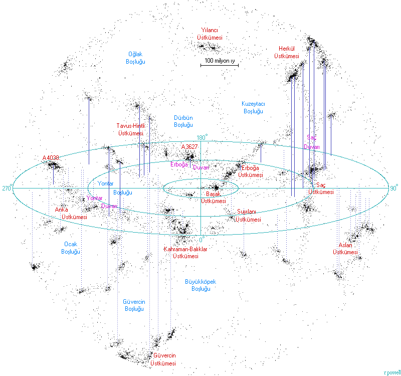 Aşağıdaki, 500 milyon ışıkyılı içerisindeki evrenin haritasıdır. Harita, Başak Üstkümesi'ni çevreleyen önemli gökada üstkümelerinden bir çoğunu gösterir. Bu üstkümeler, uzayda tek başlarına değildirler ancak daha küçük birçok başka gökada toplulukları ile birlikte, büyük boşlukları çevreleyen geniş gökada duvarlarının bir kısmını oluştururlar. En büyük boşluklardan bazıları ile birlikte, bize en yakın duvarlardan üçü haritada belirtilmiştir. 500 milyon ışıkyılı içerisinde, birkaç yüz bin büyük üstküme bulunmaktadır. Bu yüzden, bu ölçekte dahi bizim gökadamız çok önemsiz bir nesnedir. Haritanın, basılması daha kolay olabilecek negatif sürümüne buradan ulaşabilirsiniz.